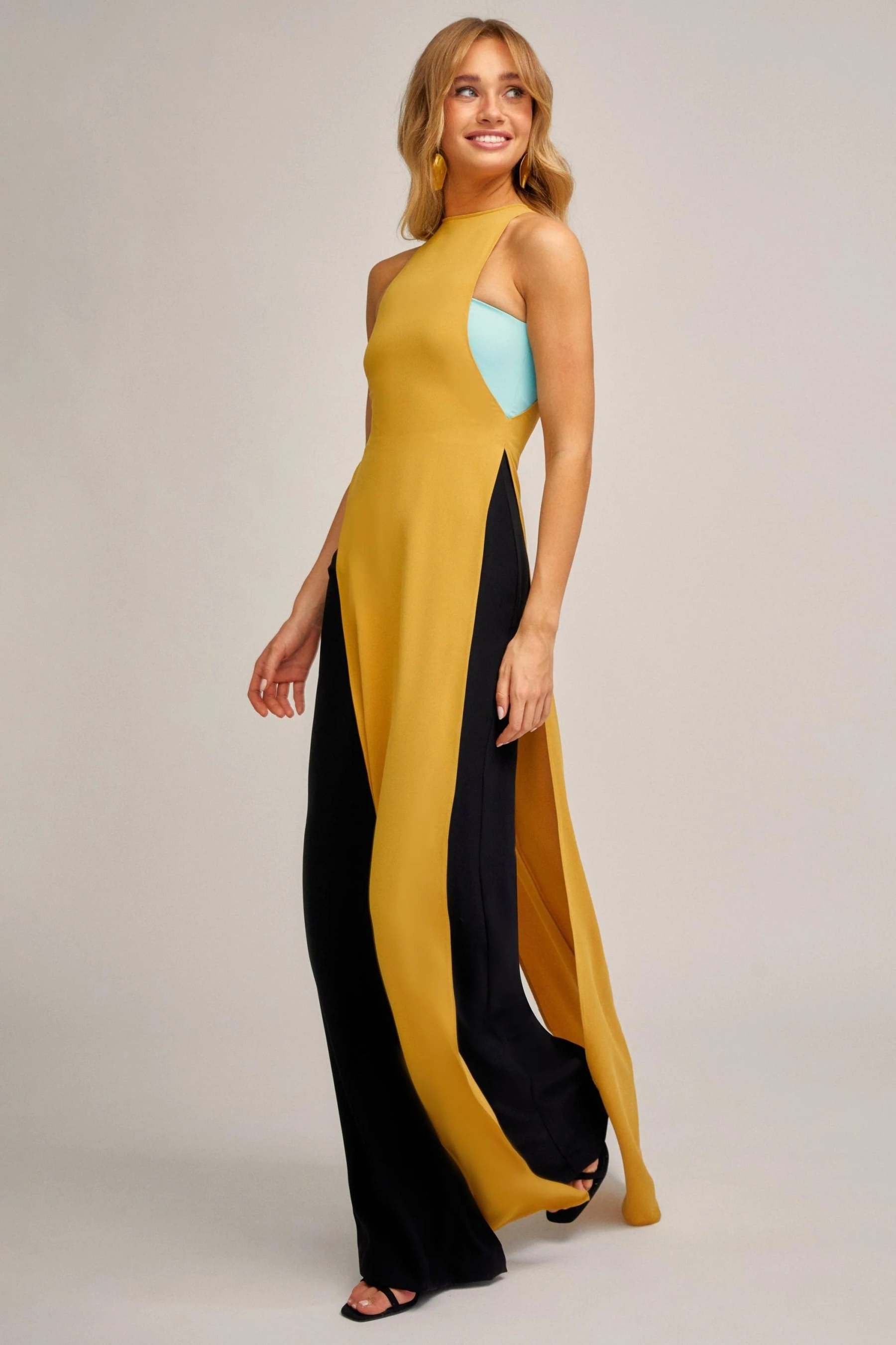 - Sin mangas, empalme, abertura, color de contraste, amarillo, vestido maxi