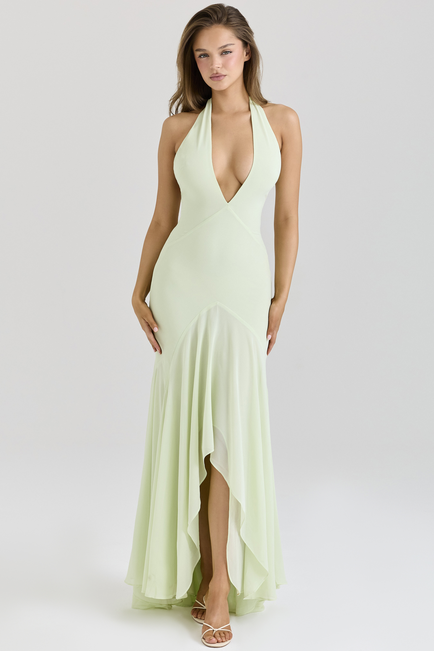 - Sleeveless, halter neck, backless, solid color, green, maxi dress