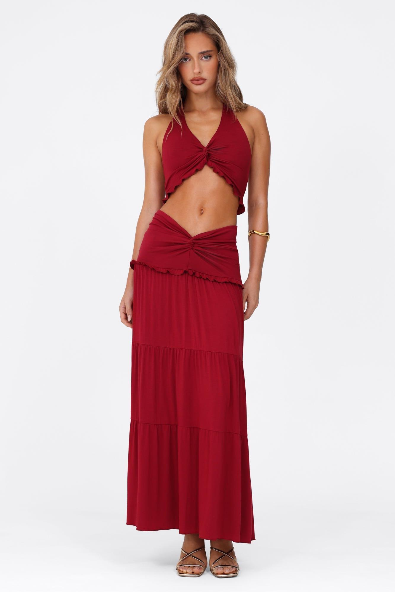 - Solid color, red, sleeveless, knotted, frill, halter neck, mid waist, maxi skirt
