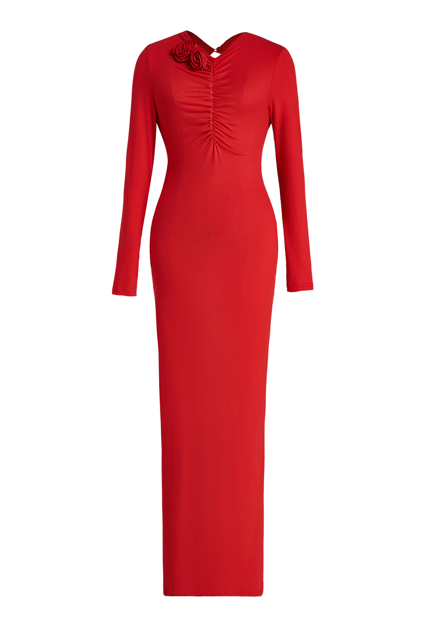 - Long sleeve, 3D flower, ruched, solid color, red, midi dress