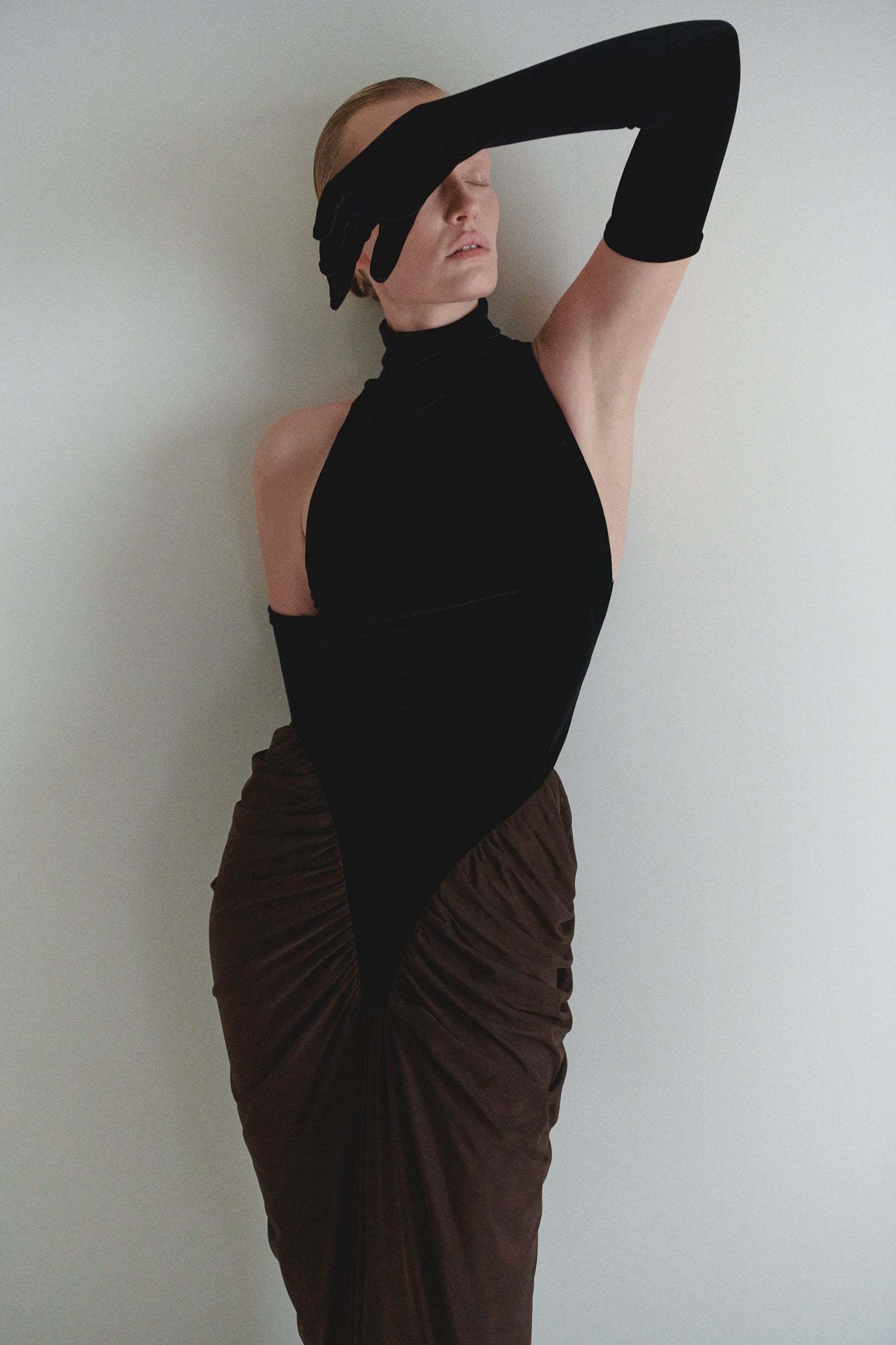 - Sleeveless, velvet, splicing, mesh, ruched, brown, with gloves, maxi dress